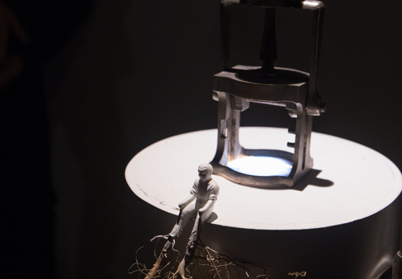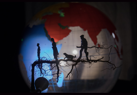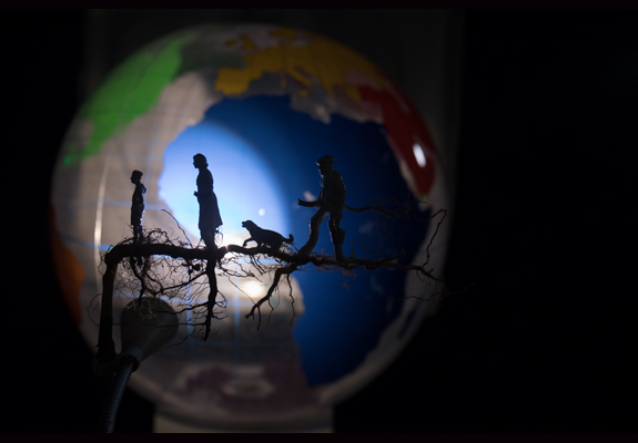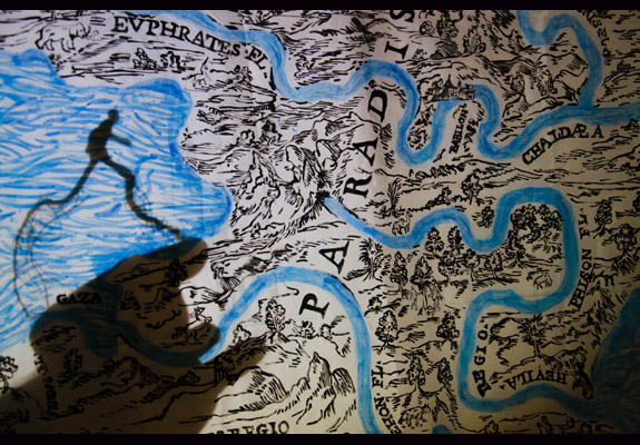 A possède les clefs du Paradis. Celui que nous cherchons, celui que nous avons perdu. Déambulant dans ce paradis terrestre, les spectateurs découvrent bien vite la maladresse de ce personnage au prénom énigmatique. Dans un crescendo d’écroulements et de chutes, on assiste impuissant à la destruction du paradis. À sa place, des bateaux échoués, une mappemonde ébranlée...Un capharnaüm qui raconte aussi l’exode de ce déraciné qui n’a plus que du sable en poche. Mais le paradis, n’est-ce pas aussi celui que l’on se crée ? De destructeur à constructeur, A s’attelle à la re-création du ciel et de la Terre, des ténèbres et de la lumière, de l’eau et du firmament. Un endroit idéal pour poser ses valises et y plonger ses racines.